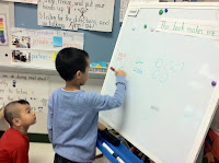 Today in math we worked on creating and trying to understand what a group was, and also what the number five was more in-depth. From the Math in the City workshop I attended on Wednesday I was able to implement some of the material in today's lesson. I used questioning as what did you see, and how did you know?, which really helped to facilitate the level of answers and explanations from the students. They worked in partnerships with the reckon wrack to create different combinations.