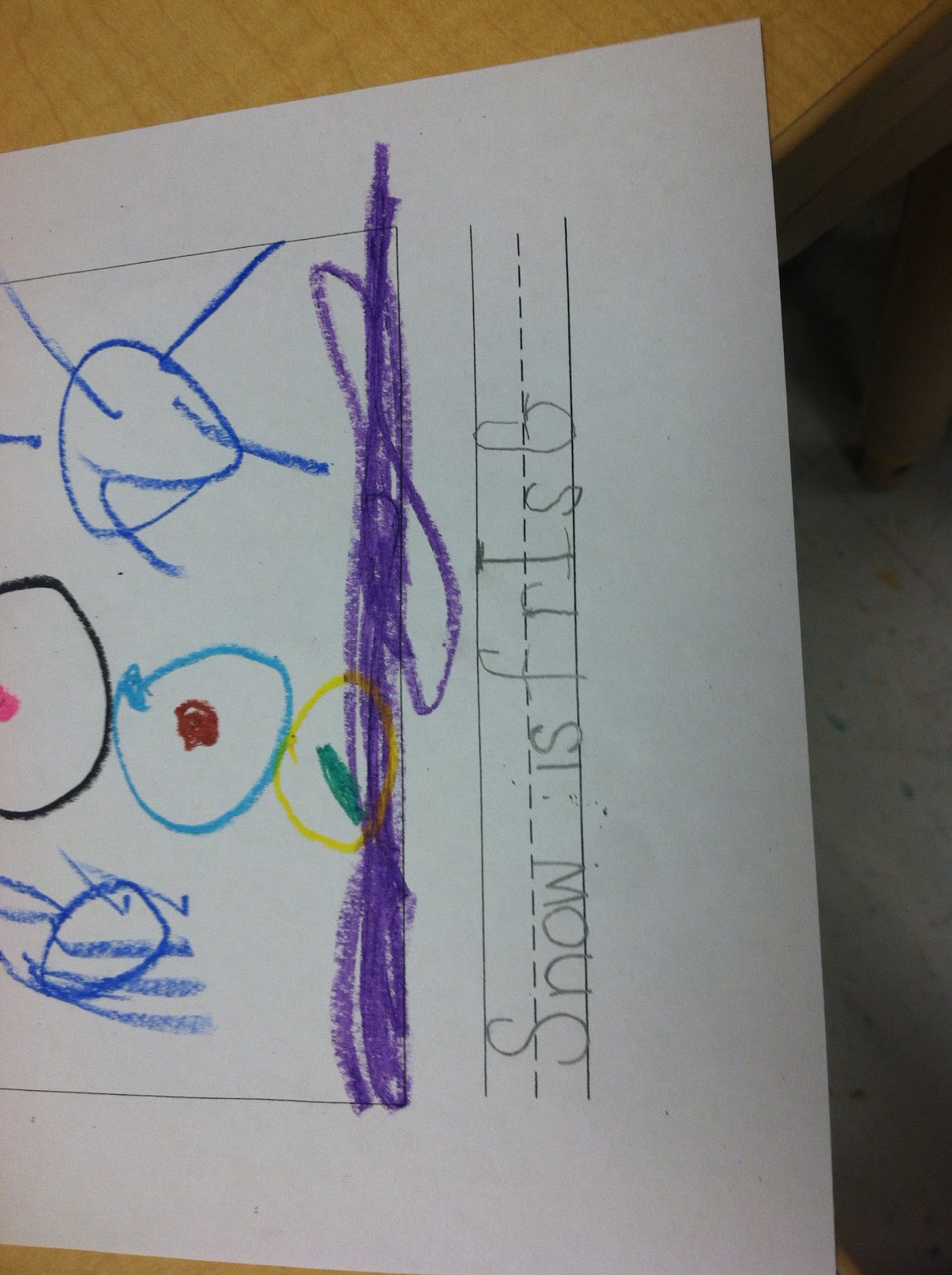 During literacy centers students noticed that the weather had started to change and some of them saw snow starting to fall. They wanted to change the tree because they said there were no longer leaves on it, but rather snow. S, and A worked on labeling with new winter words and created a new tree in the room. This then lead to a group of students working on a small pattern book SNOW IS......... This was such a great center because we have been reading a lot of pattern books in class.During language development centers a small group continued their investigation of dinosaurs. K discussed that he thought birds came from dinosaurs and then the discussion moved into what other species of animals could come from dinosaurs. Mr. Andy has a bearded dragon, so the students, K, K, and W went down to prek and took a picture. When they returned they were amazed to see how much the bearded dragon resembled the dinosaur. They then took their ideas and created a collage with paper of different dinosaurs. K even used the labtop to help label with B, and HS.